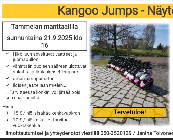 14.10. Tiistaina Humppilassa 17.30 alkaen ala-koulun pihalla pompitaan. Tervetuloa mukaan pomppimaan. Kenkävaraukset Eevalta numerosta 0505737871. 🔥🔥🍁